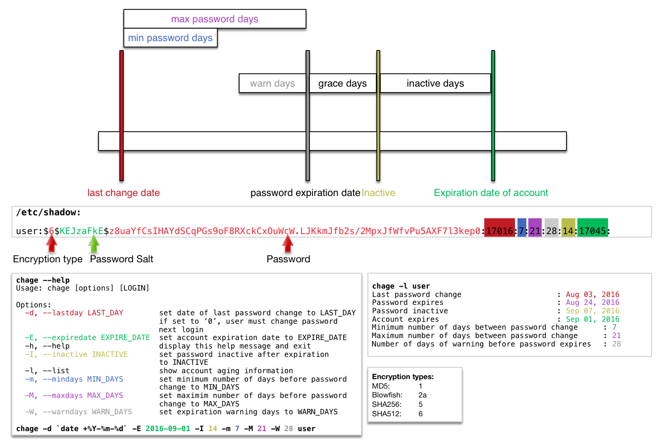 Usually the password and account ageing is configured in /etc/shadow. Next picture describes the chage tool and the shadow file: